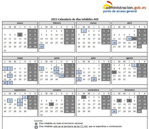 El 1 de diciembre de 2021 se publica en el Boletín Oficial del Estado (BOE) la Resolución de 24 de noviembre de 2021, de la Secretaría de Estado de Función Pública, por la que se establece a efectos de cómputo de plazos, el calendario de días inhábiles en el ámbito de la Administración General del Estado para el año 2022.