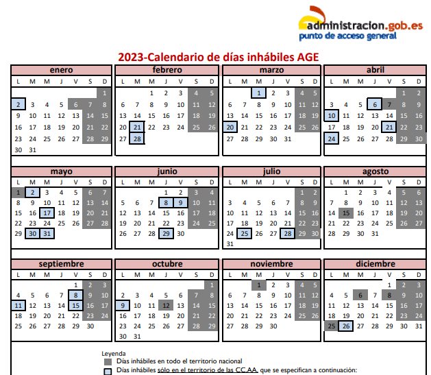 El 16 de diciembre de 2022 se publica en el Boletín Oficial del Estado (BOE) la Resolución de 1 de diciembre de 2022, de la Secretaría de Estado de Función Pública, por la que se establece a efectos de cómputo de plazos, el calendario de días inhábiles en el ámbito de la Administración General del Estado para el año 2023.
