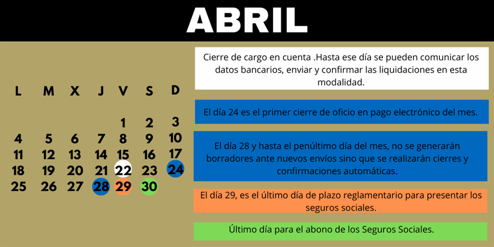 - Día 22: Es el último día para el cierre de cargo en cuenta. Hasta ese día se pueden comunicar los datos bancarios, enviar y confirmar las liquidaciones.
