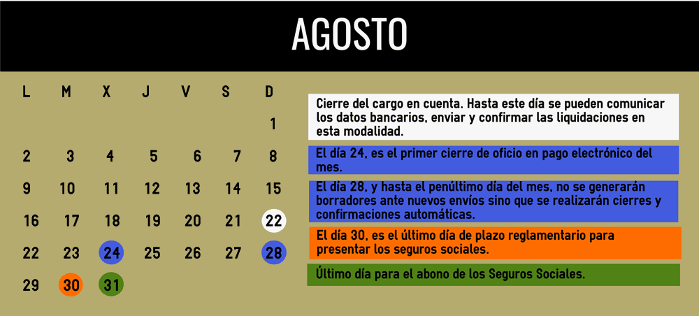 - Penúltimo día del mes: Fin del periodo para solicitar o enviar la liquidación por pago electrónico hasta las 23:59 h.
