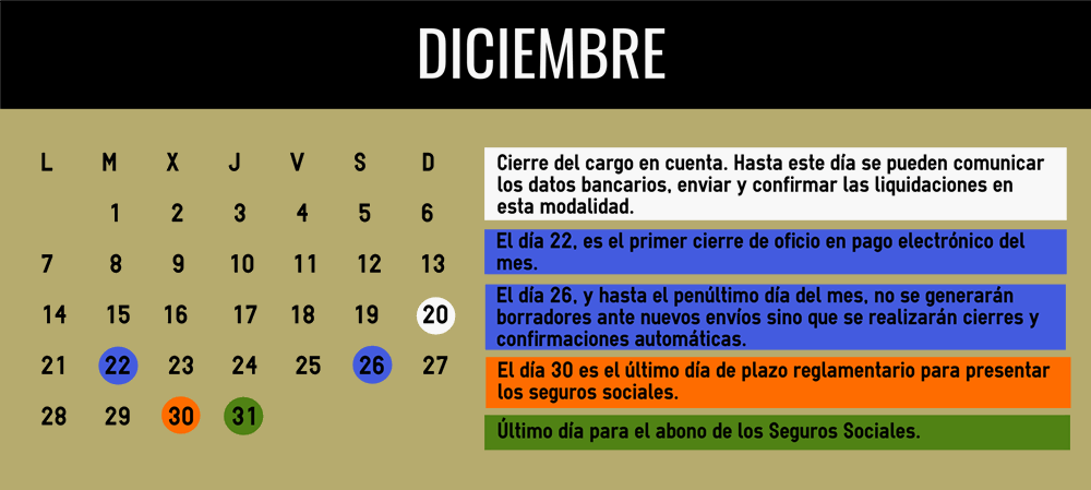 Día 20: Es el último día para el cierre de cargo en cuenta. Hasta ese día se pueden comunicar los datos bancarios, enviar y confirmar las liquidaciones.