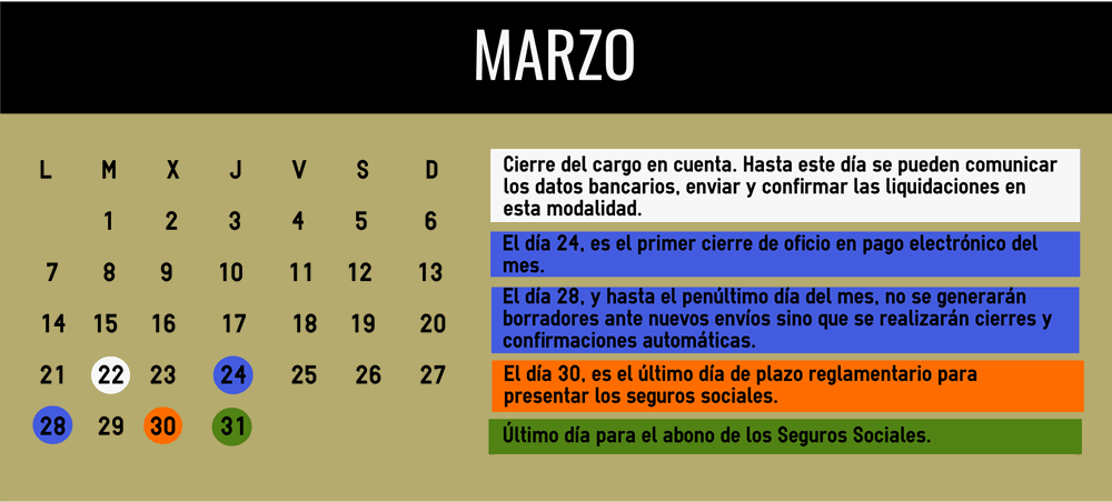 - Último día del mes: Pago de los Seguros Sociales por pago electrónico mediante el RLC emitido por la TGSS.