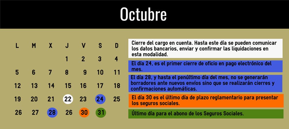 Día 22: Es el último día para el cierre de cargo en cuenta. Hasta ese día se pueden comunicar los datos bancarios, enviar y confirmar las liquidaciones.