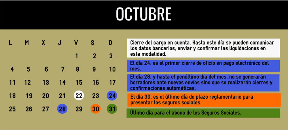 - Penúltimo día del mes: Fin del periodo para solicitar o enviar la liquidación por pago electrónico hasta las 23:59 h.