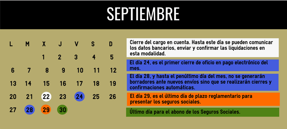 - Último día del mes: Pago de los Seguros Sociales por pago electrónico mediante el RLC emitido por la TGSS.