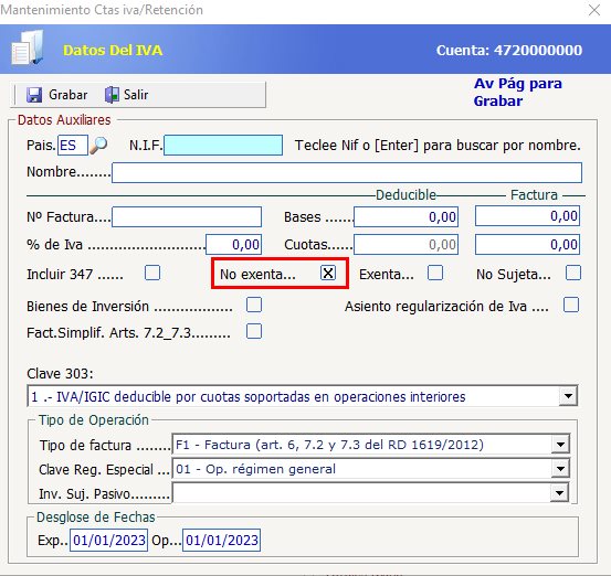 Se incorpora una nueva opción de configuración en la ficha de las subcuentas de proveedor, de tal forma que se puede establecer la opción de exención por defecto a la hora de introducir apuntes contra dicho proveedor. Las opciones disponibles son:
