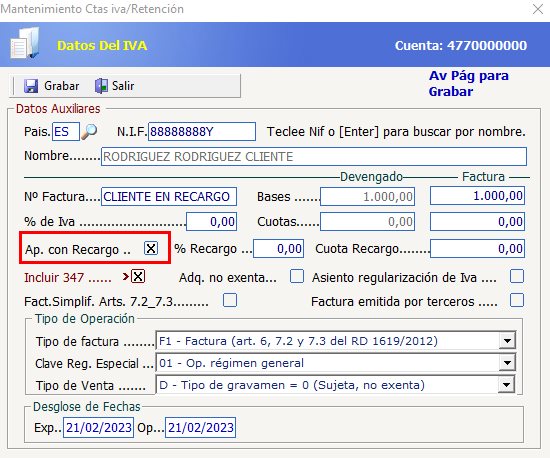 Si esta operación de ingreso gravada al 0% se estuviese contabilizando con respecto a un cliente acogido al régimen de recargo de equivalencia, por defecto, la base de este apunte se informaría tanto en el apartado de régimen general al 0% como en el apartado de recargo de equivalencia al 0% del modelo 303. Si no se deseasen incluir estas bases como bases de recargo de equivalencia en las operaciones al 0% será necesario desmarcar la opción "Ap. con recargo" desde el diario en la línea 477.0: