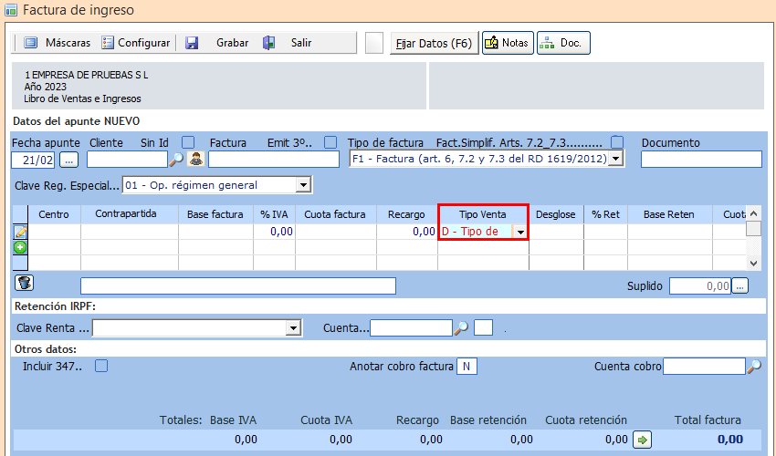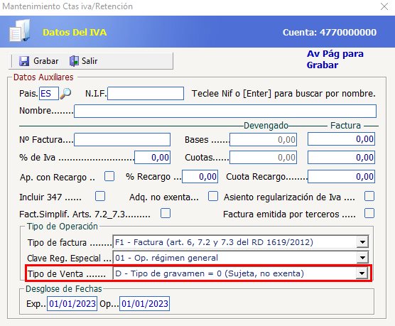 Para indicar que una operación de ingreso está gravada al 0% y que, por tanto, está sujeta y no exenta de IVA será necesario seleccionar la clave "D - Tipo de gravamen = 0" dentro del desplegable "Tipo de Venta". Dicho desplegable figura tanto en la Entrada Rápida de facturas como en la línea 477.0 del diario: