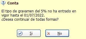 La AEAT ha actualizado las validaciones técnicas, tal y como indican en el "Documento de validaciones y errores" del SII, de tal forma que el sistema admite el tipo impositivo del 5% y el recargo de equivalencia correspondiente (0,62%) en aquellas facturas expedidas/recibidas cuya fecha de operación sea posterior al 01/07/2022.