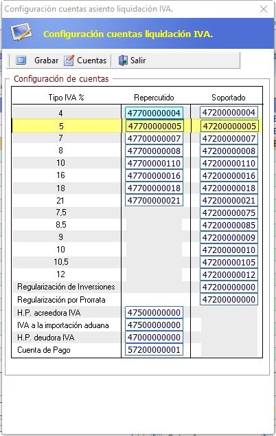 Se incorporan las subcuentas correspondientes al 5% tanto para el IVA repercutido como para el IVA soportado, de cara a la posterior realización del asiento de liquidación automática de IVA a partir de los modelos 303 que figuren en estado telemático en el programa: