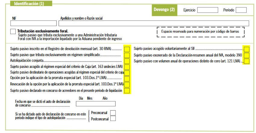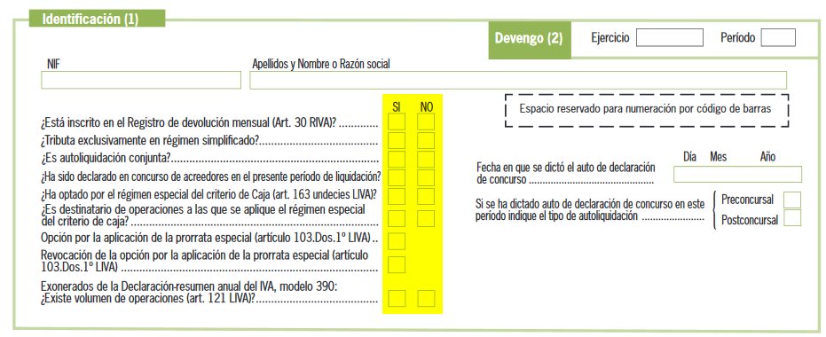 - Se modifica el formato de las casillas del apartado «Identificación» del modelo, transformando el diseño de cumplimentación de las mismas mediante dos casillas excluyentes en un diseño basado en una única casilla. Al mismo tiempo, se adapta la denominación de las casillas al nuevo diseño: