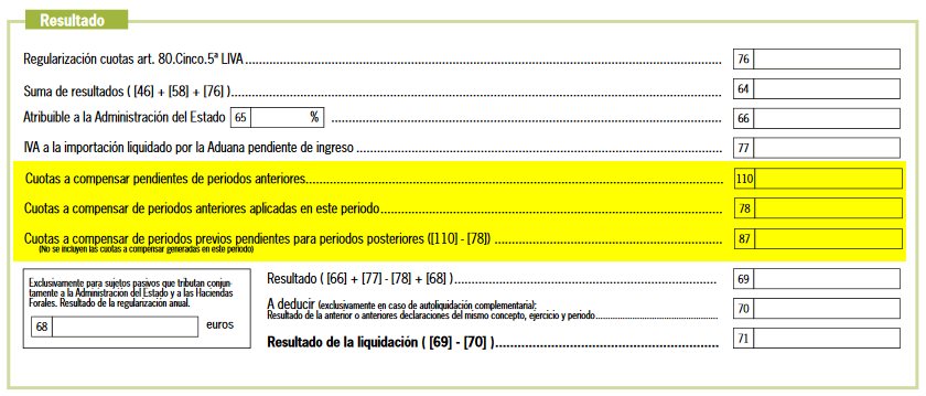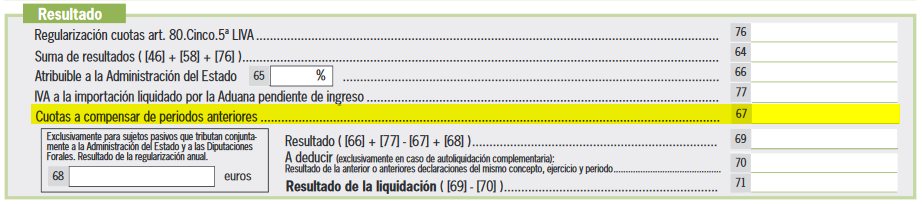 - En el apartado «Resultado» del modelo 303, la casilla 67, que hasta ahora mostraba las cuotas pendientes de compensación aplicadas en la autoliquidación, se desglosa en tres nuevas casillas que facilitarán al contribuyente conocer los saldos de las cuotas a compensar aplicados y pendientes en cada período: