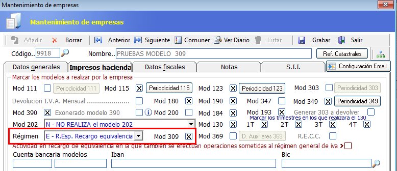 Se ha añadido el modelo 309 a la relación de modelos disponibles dentro del "Mantenimiento de empresas > Impresos Hacienda":
