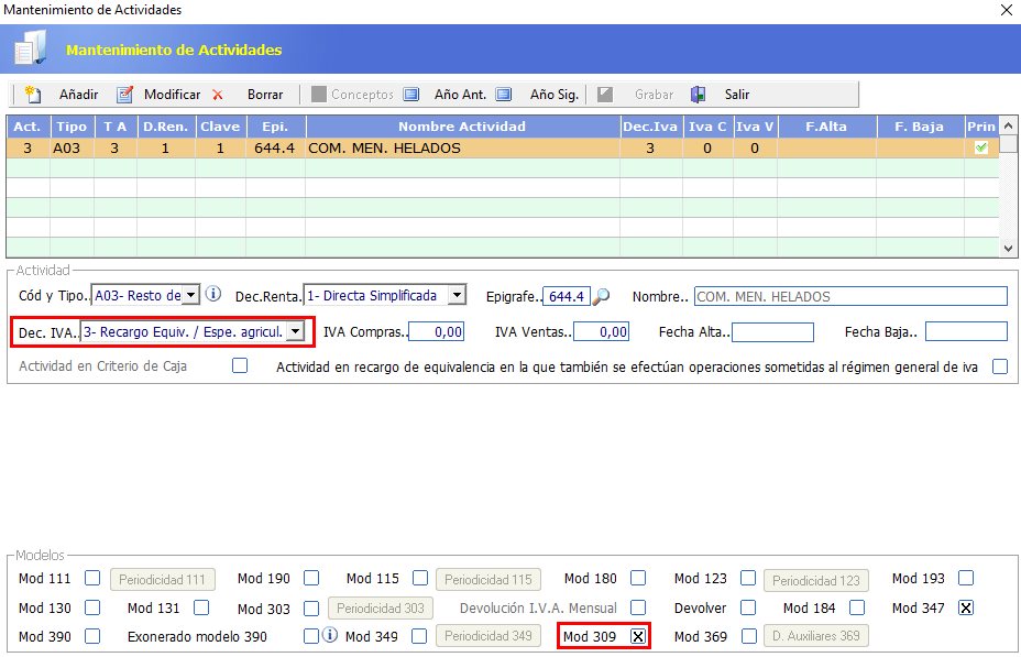 Se ha añadido el modelo 309 a la relación de modelos disponibles dentro del "Mantenimiento de actividades":