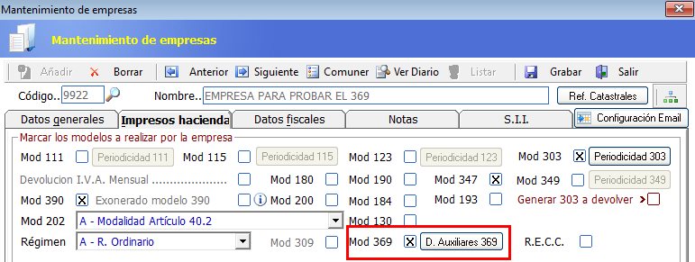 Se ha añadido el modelo 369 a la relación de modelos disponibles dentro del "Mantenimiento de empresas > Impresos Hacienda":