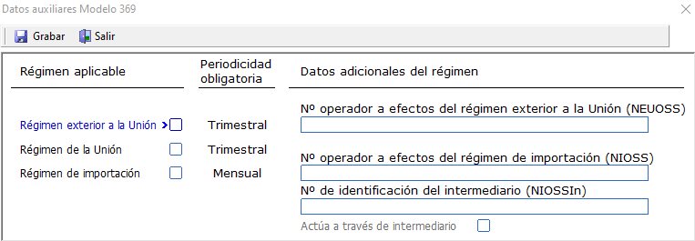 En el caso del modelo 369 es necesario acceder también a la opción "Datos auxiliares" y cumplimentar los datos que correspondan en relación con el régimen de aplicación que corresponda: