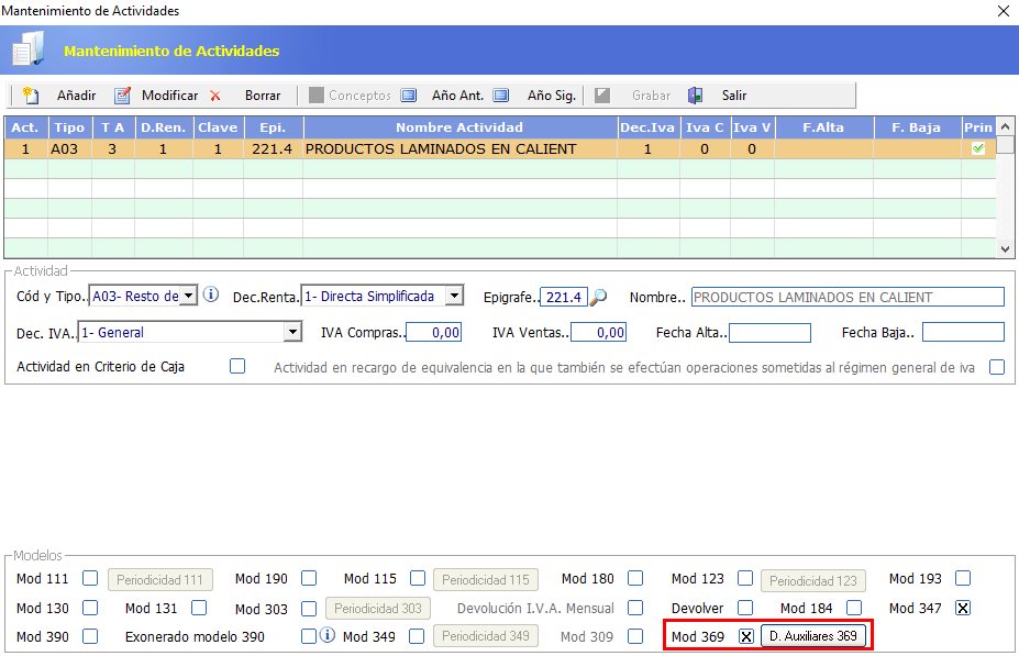 Se ha añadido el modelo 369 a la relación de modelos disponibles dentro del "Mantenimiento de actividades":