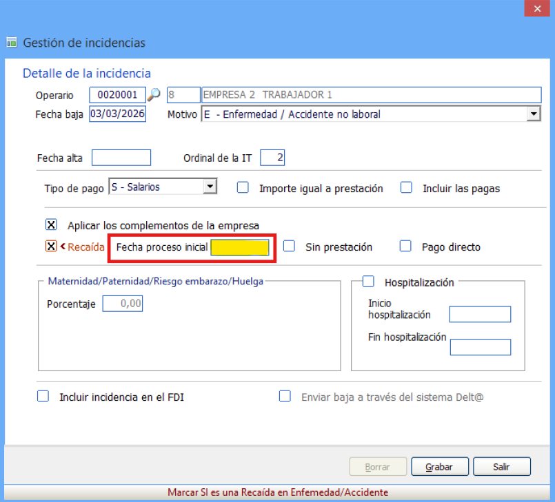 ✔️ Si la incidencia inicial ocurrió en otra empresa o en un ejercicio anterior y no está registrada en el código del trabajador del ejercicio actual, habrá que añadirla manualmente con las fechas correctas.